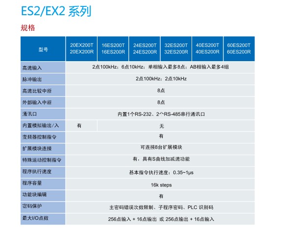 DVP40ES200T 40点主机,24DI/16DO(NPN/24Vdc/0.5A),   2路100K输入/输出,2路20K输入/输出, AC电源