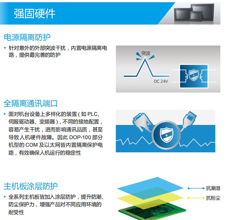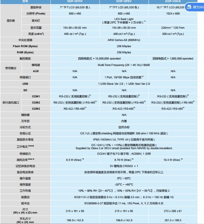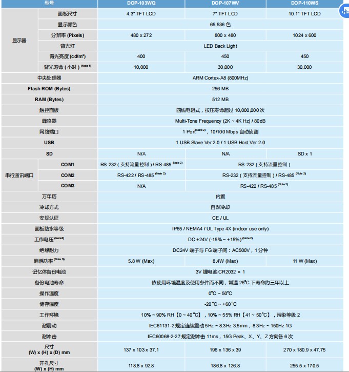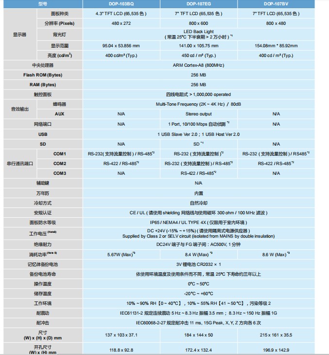 HMI DOP-107WV 7"/分辨率800x480/U盘/打印机/鼠标/集成以太网/窄边框, 高亮度大于400流明,COM1:RS232, COM2:RS-232/485, COM3:RS-422/485,