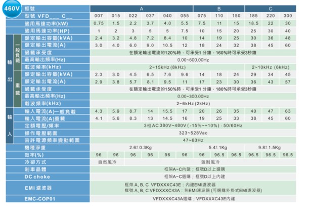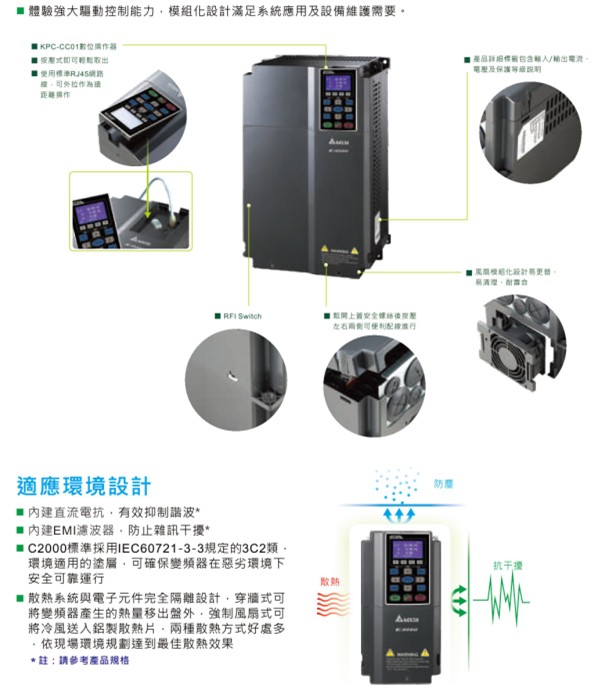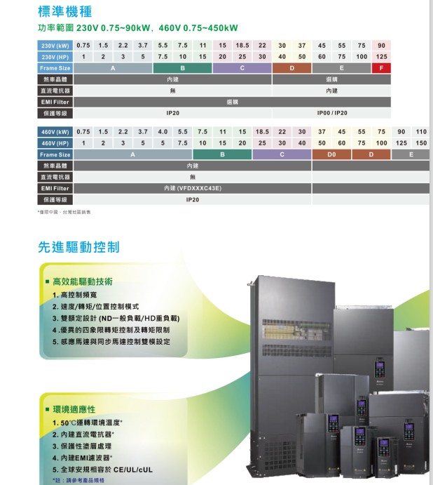 VFD-C2000 VFD022C43E 380V/3P,2.2kW,内置10k PLC,内建刹车,DC电抗选购,EMI内建,UL,CE