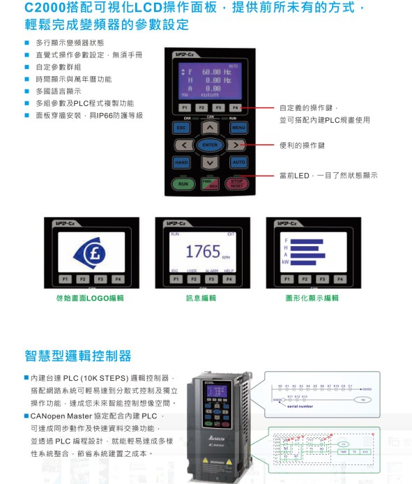 VFD-C2000 VFD015C23A 220V/3P,1.5kW,内置10k PLC,内建刹车,DC电抗选购, UL,CE