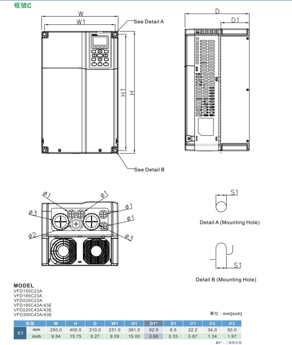 VFD-C2000 VFD450C43U 380V/3P,45kW,内置10k PLC,刹车选购,DC电抗内建,EMI内建,UL,CE,缩小版,含接线盒